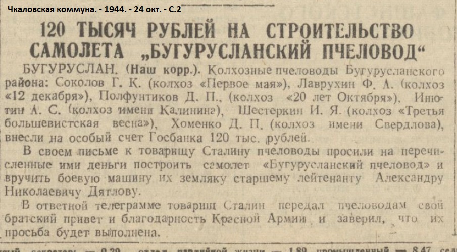 Дятлов Александр Никитович - летчик самолета "Бугурусланский пчеловод"
